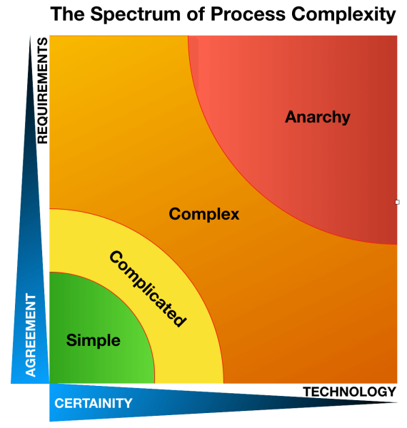 The 3rd industrial revolution (digital revolution) saw to it that simple and complicated tasks (in software development as well as the development organisation) are already addressed or have a well defined, predictable way of being addressed. Any problem that remains to be solved in the modern era is at best complex or is in total anarchy.