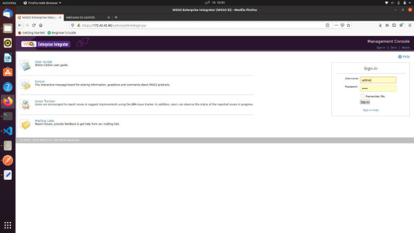 Finally, access the EI management console through NGINX. Open another tab and go to https://<LB_IPADDRESS>/carbon. In this case, it is https://172.42.42.60/carbon/admin/login.jsp.
