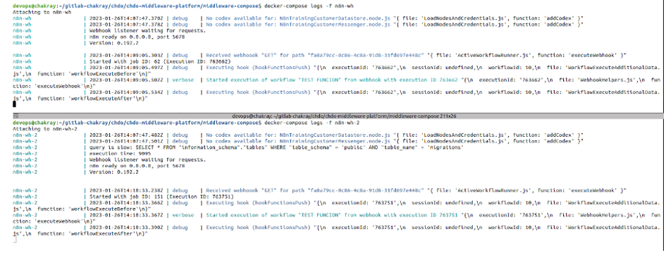 devops@chakray:~$ docker-compose logs -f n8n-worker Attaching to n8n-worker n8n-worker | Starting n8n worker... n8n-worker | n8n-worker | n8n worker is now ready n8n-worker | * Version: 0.192.2 n8n-worker | * Concurrency: 10 n8n-worker | n8n-worker | n8n-worker | n8n worker health check via, port 5678 n8n-worker | Execution is working! n8n-worker | Execution is working! n8n-worker | Execution is working! devops@chakray:~$ docker-compose logs -f n8n-worker-2 Attaching to n8n-worker-2 n8n-worker-2 | Starting n8n worker... n8n-worker-2 | n8n-worker-2 | n8n worker is now ready n8n-worker-2 | * Version: 0.192.2 n8n-worker-2 | * Concurrency: 10 n8n-worker-2 | n8n-worker-2 | n8n-worker-2 | n8n worker health check via, port 5678 n8n-worker-2 | Execution is working! n8n-worker-2 | Execution is working!