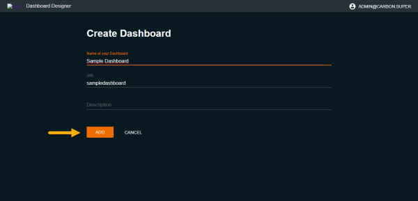 4.3 En la siguiente ventana debemos ingresar el nombre que tendrá nuestro dashboard, para este ejemplo utilizaremos Sample Dashboard, para continuar damos clic en el botón ADD.