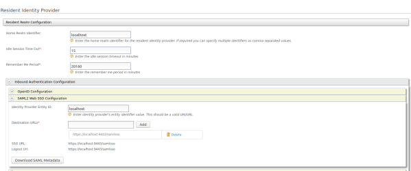 Haga clic en el botón de flecha para expandir los formularios de Inbound Authentication Configuration, expanda la pestaña de SAML2 Web SSO Configuration haga clic y en botón de Download SAML Metadata.
