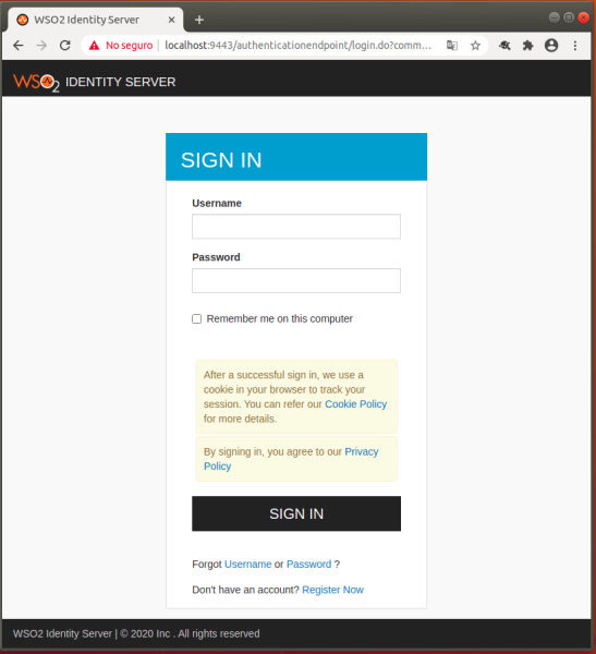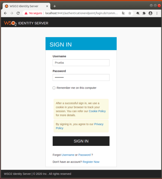 - En la cual se mostrará el formulario de autenticación de WSO2 Identity Server, y en el cual se ingresa las credenciales del usuario anteriormente creado.