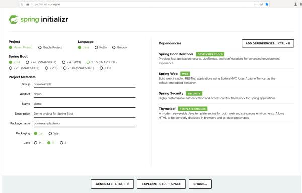 Nota: también se puede cambiar la herramienta con la que se puede construir el proyecto (Maven o Gradle), el lenguaje (Java, Kotlin, Groovy) y la versión de Spring Boot.