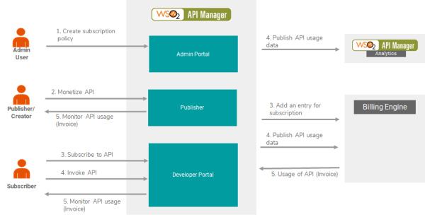 En la documentación oficial, se muestra un ejemplo de la integración de WSO2 API Manager con Stripe como su motor de facturación para manejar los pagos para la monetización de API, sin embargo, como se puede observar en este post, usted puede usar cualquier implementación personalizada utilizando el motor de facturación de su preferencia.