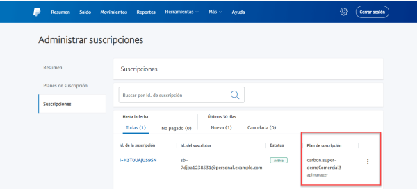 En su cuenta de Paypal, en la opción Suscripciones se podrá visualizar la suscripción recientemente creada.