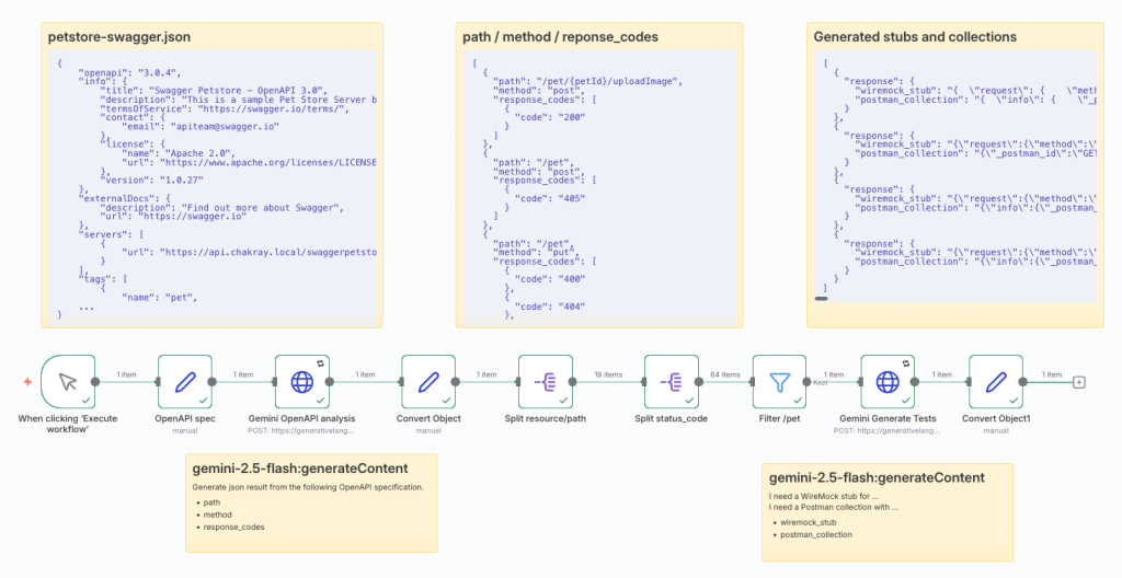 3. Iterar cada tupla path/method/code para obtener un stub de Wiremock que cumpla con la especificación de nuestra API para esa tupla y una colección de Postman, con sus correspondientes scripts de pruebas, que nos permita verificar el correcto funcionamiento de esa tupla en concreto. Para pruebas de performance o cargas más complejas, se pueden complementar con herramientas como JMeter o Gatling según la necesidad.