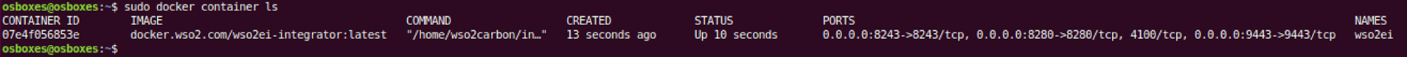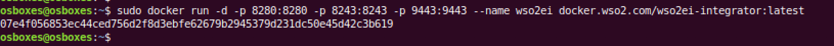 $docker run -d -p 8280:8280 -p 8243:8243 -p 9443:9443 –name wso2ei docker.wso2.com/wso2ei-integrator:latest