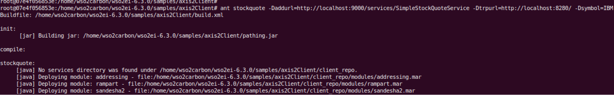 $ ant stockquote -Daddurl=http://localhost:9000/services/SimpleStockQuoteService -Dtrpurl=http://localhost:8280/ -Dsymbol=IBM