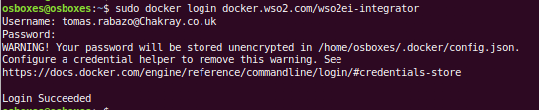 Para ello primeramente nos debemos logear en el repositorio Docker de WSO2 usando las credenciales que tengamos en la web de WSO2. Si no tienes credenciales debes crearte una cuenta en esa web.