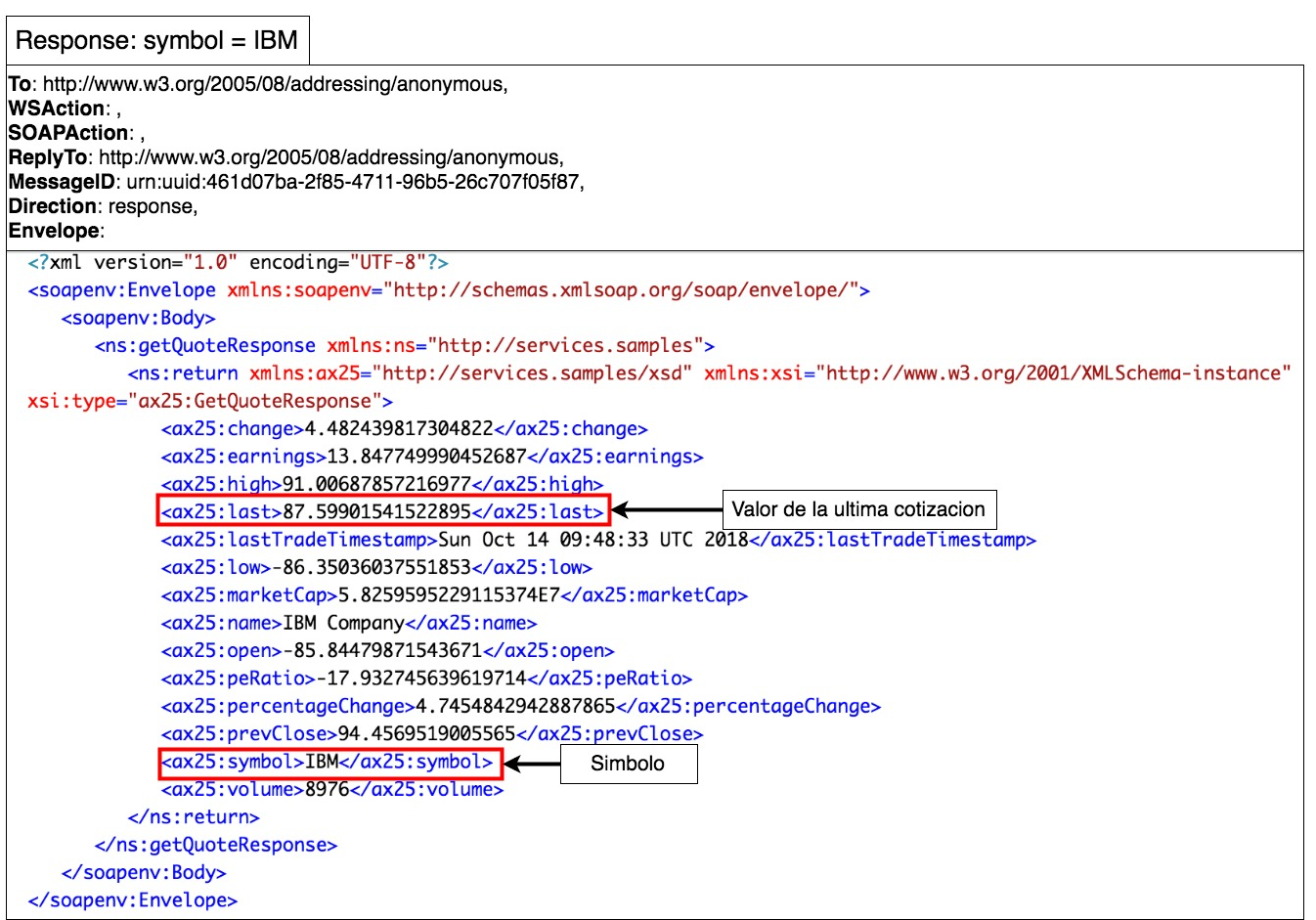En la request se puede comprobar que el valor del tag symbol es IBM. El valor coincide con el de la expresión regular del primer case de la secuencia ESB. Por tanto, se envía el mensaje al punto final SimpleTockQuoteService.