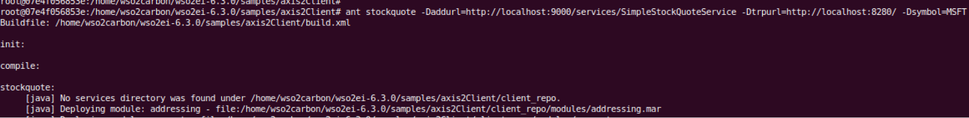 $ ant stockquote -Daddurl=http://localhost:9000/services/SimpleStockQuoteService -Dtrpurl=http://localhost:8280/ -Dsymbol=MSFT
