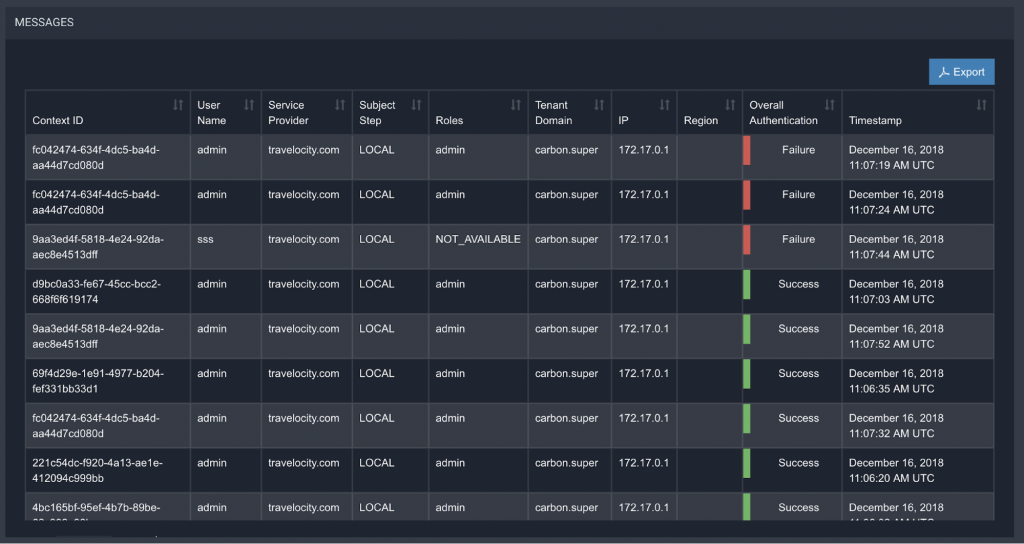 En esta misma pantalla al final se muestra un listado del detalle en modo Excel de la información de cada acción de logado donde se lista Context ID o identificador de la sesión, nombre de usuario usado en el login, el Service Provider al cual el usuario intenta tener acceso, Subject Setp, el role del usuario, el tenant, IP, region, resultado del logado, y tiempo en el que se realizó el proceso de intento de logado.