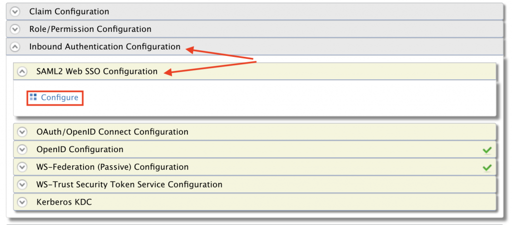 Ahora hay que ir a la sección Inbound Authentication Configuration y dentro de la misma a SAML2 Web SSO Configuration. Haz click en Configure: