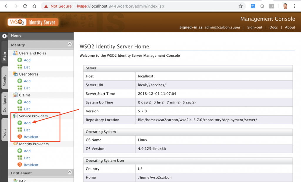 Para ello hay que acceder a la consola del Identity Server: https://localhost:9443/carbon/admin/login.jsp, usuario y contraseña: admin/admin.