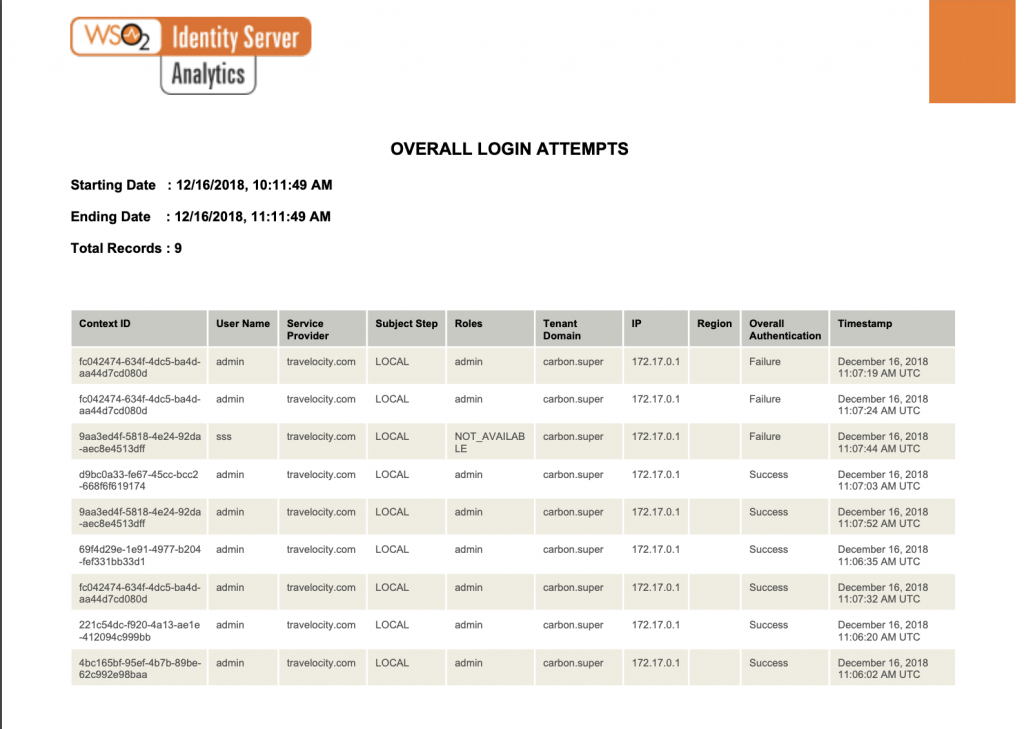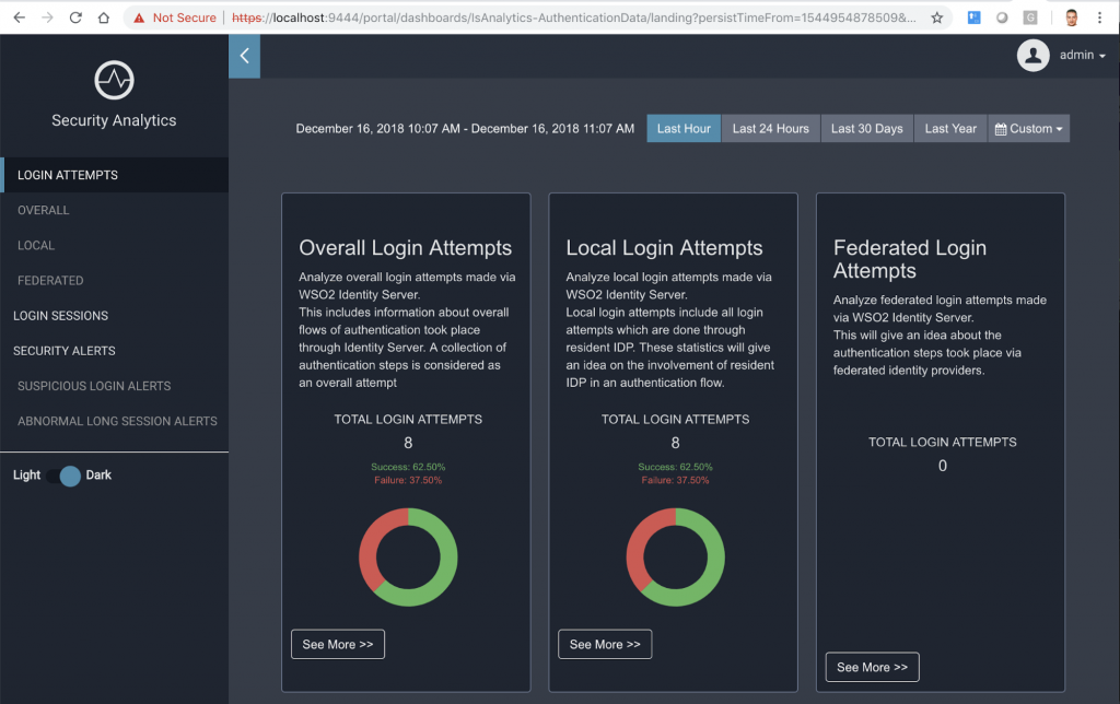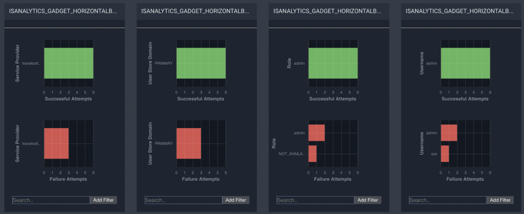 WSO2 Identity Server Analytics te permitirá ver y analizar estadísticas relacionadas con las solicitudes de autenticación que pasan por WSO2 Identity Server. Puede configurar WSO2 IS para publicar eventos relacionados con la autenticación en WSO2 Identity Server Analytics para que vea y analice lo siguiente: