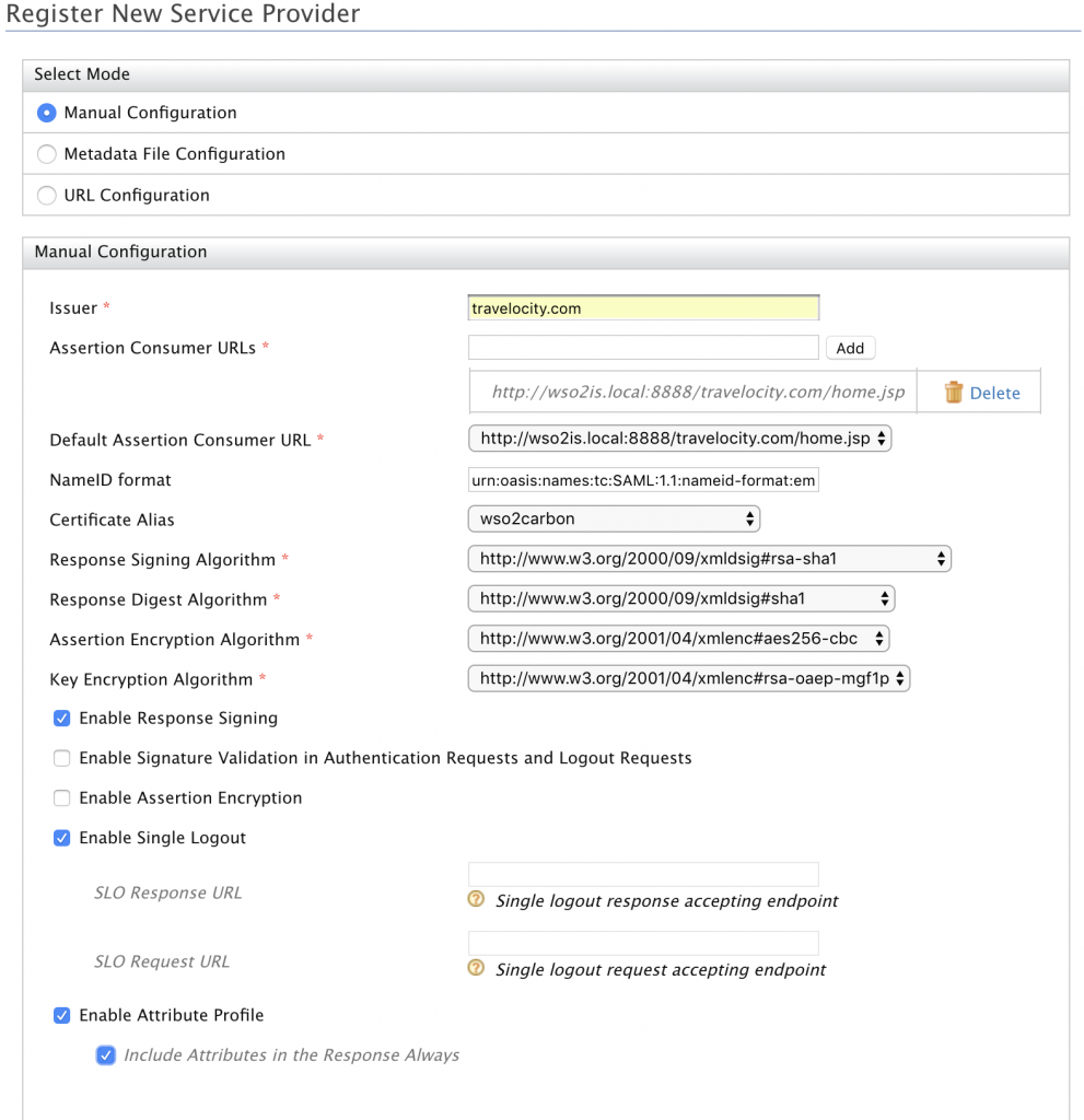 Assertion Consumer URLs: Este es el punto final usado por el Identity Provider en el Identity Server al cual van redirigidas las respuestas a las solicitudes de autenticación del Service Provider. Es el Assertion Consumer Service (ACS) del Service Provider. Si la petición que viene del Service Provider está firmada y contiene otra url de ACS el Identity Server usará esa otra URL como ACS. El valor de este campo tiene que coincidir con el que hemos puesto en: travelocity.properties en: SAML2.AssertionConsumerURL.