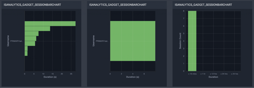 En los siguientes widgets se presenta las sesiones más largas que tuvieron lugar durante un intervalo de tiempo dado por la duración de la sesión. En el centro, la duración media de una sesión basada en los usuarios más frecuentes para el intervalo de tiempo seleccionado. Y al final a la derecha se agrupan las sesiones por la duración y muestra el número de sesiones para cada grupo durante el intervalo de tiempo dado.