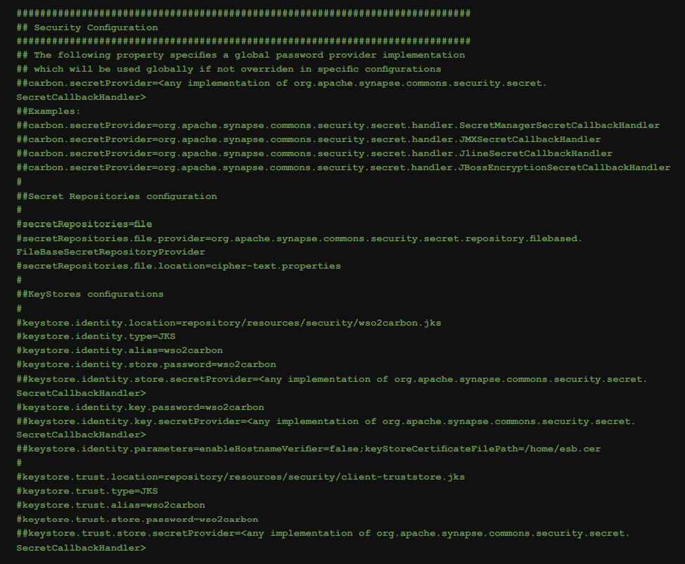 Cela spécifie la configuration de l’outil de chiffrement pour chiffrer les valeurs que nous avons définies dans le Secret Repository. Ces paramètres incluent le type de fichier, le chemin où se trouve ce fichier, le mot de passe, son alias, le magasin de clés (KeyStore), etc. En d’autres termes, il contient toutes les informations que l’outil de chiffrement a utilisées pour crypter les valeurs. Ce fichier est « secret-conf.properties » qui se trouve dans «${carbon.home}/conf/security ». Ce fichier existe par défaut, mais toutes ses lignes sont incluses. C’est au démarrage de l’outil Cipher que ce fichier prend de l’importance, puisque certains paramètres sont définis.