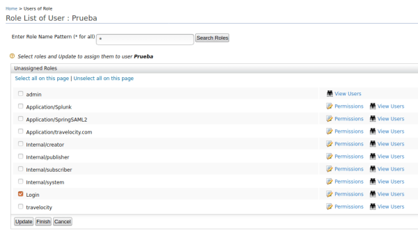 In the users’ options, click on the Assign Roles option in the Test user that was created. Performing this action will display another list with the roles that can be assigned to the user, select the Login role.