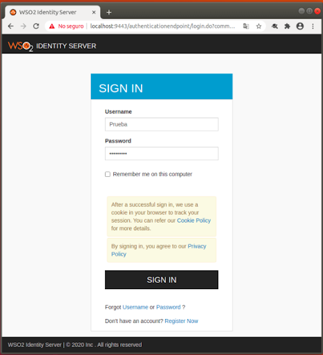 Ici, le formulaire d’authentification WSO2 Identity Server sera affiché et dans lequel les informations d’identification utilisateur précédemment créées sont entrées.