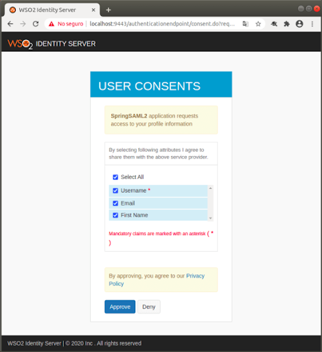 Ensuite, l’application SpringSAML2 demande l’accès aux informations de profil de l’utilisateur.