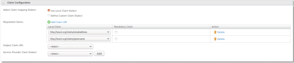 - Configuration de la revendication: où les revendications qui seront envoyées dans les assertions sont configurées, dans lequel le dialecte des revendications locales (wso2.org) sera utilisé.
