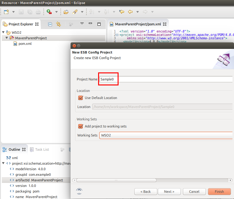 As you can see, in the blue square you can find the ESB configuration project. In the Multi-Module Project’s POM file you can find the new Sample0 module (red square).