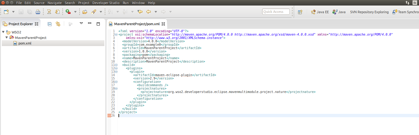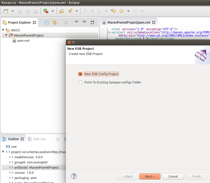 The Multi-Module project has been created with its associated POM file. Within this project, create the ESB project. Select the Multi-Module project, right click and create the ESB Config project.